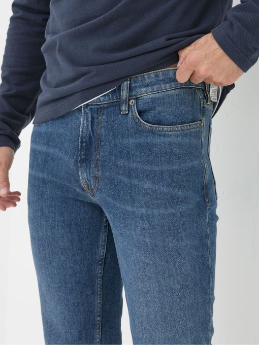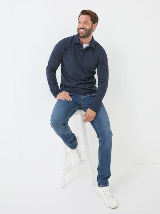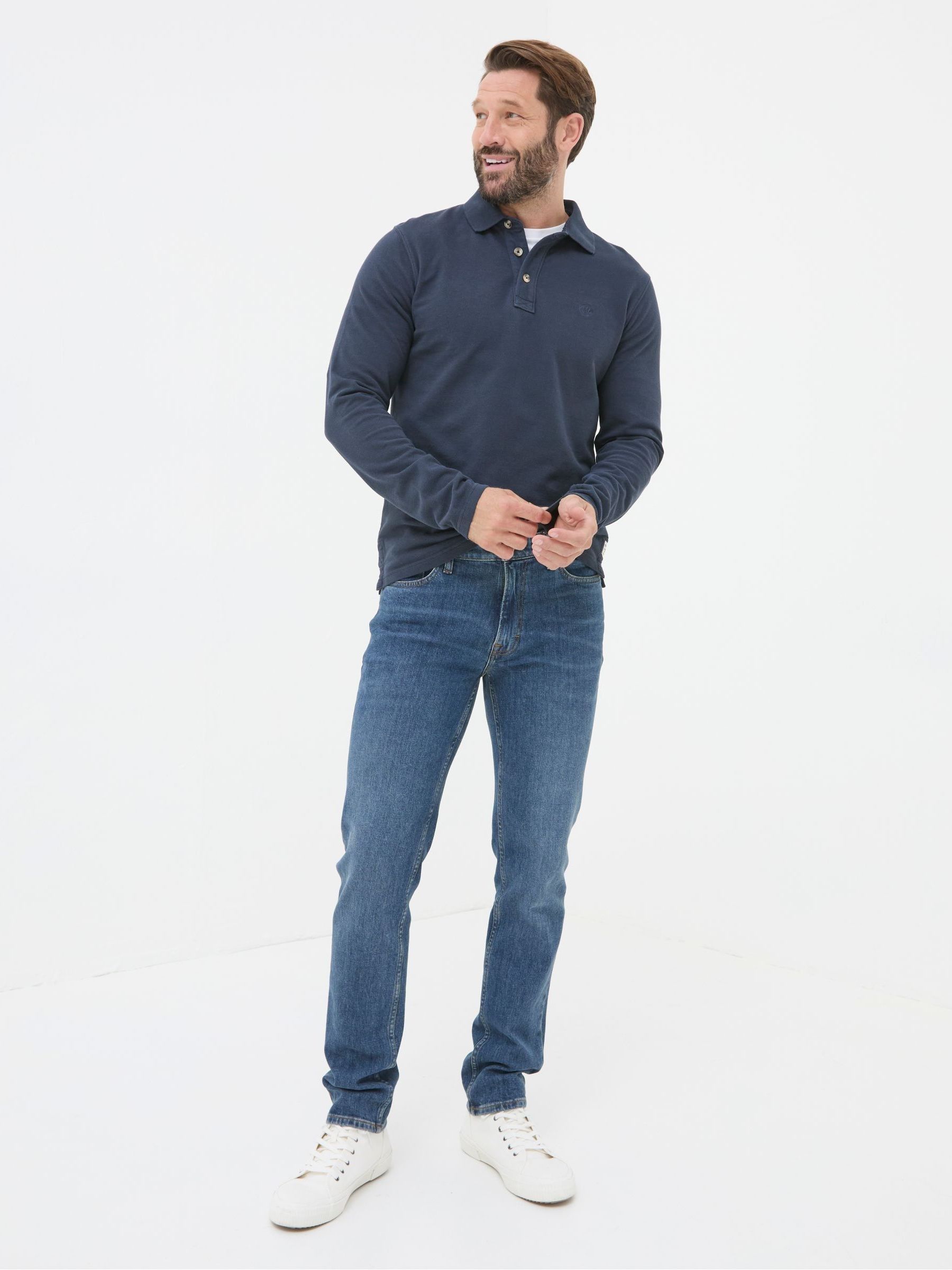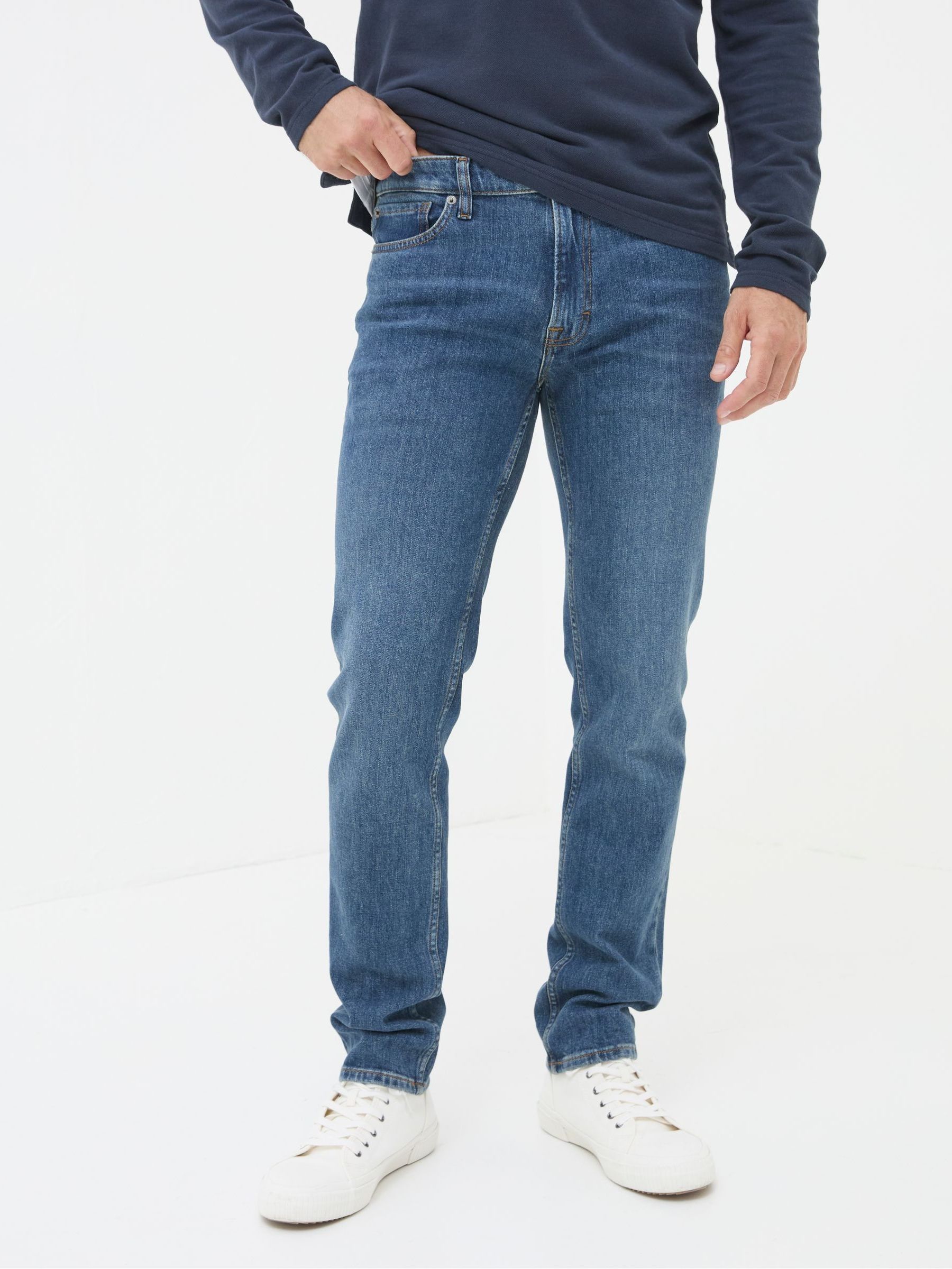 Our slim fit gradually slims from the hip to the ankle for a contemporary choice. We’ve added a touch of stretch for comfort and easy movement.They’ve also been given a wash before they get to you for an authentic look. Great for weekend wear when relaxing with friends. Try pairing it with a T-Shirt and trainers for a relaxed style.Gradually slims for hip to ankleTouch of stretch for easy movementZip & button flyRegular inside leg length 32" / 81cm.Long inside leg length 34" / 86cm.