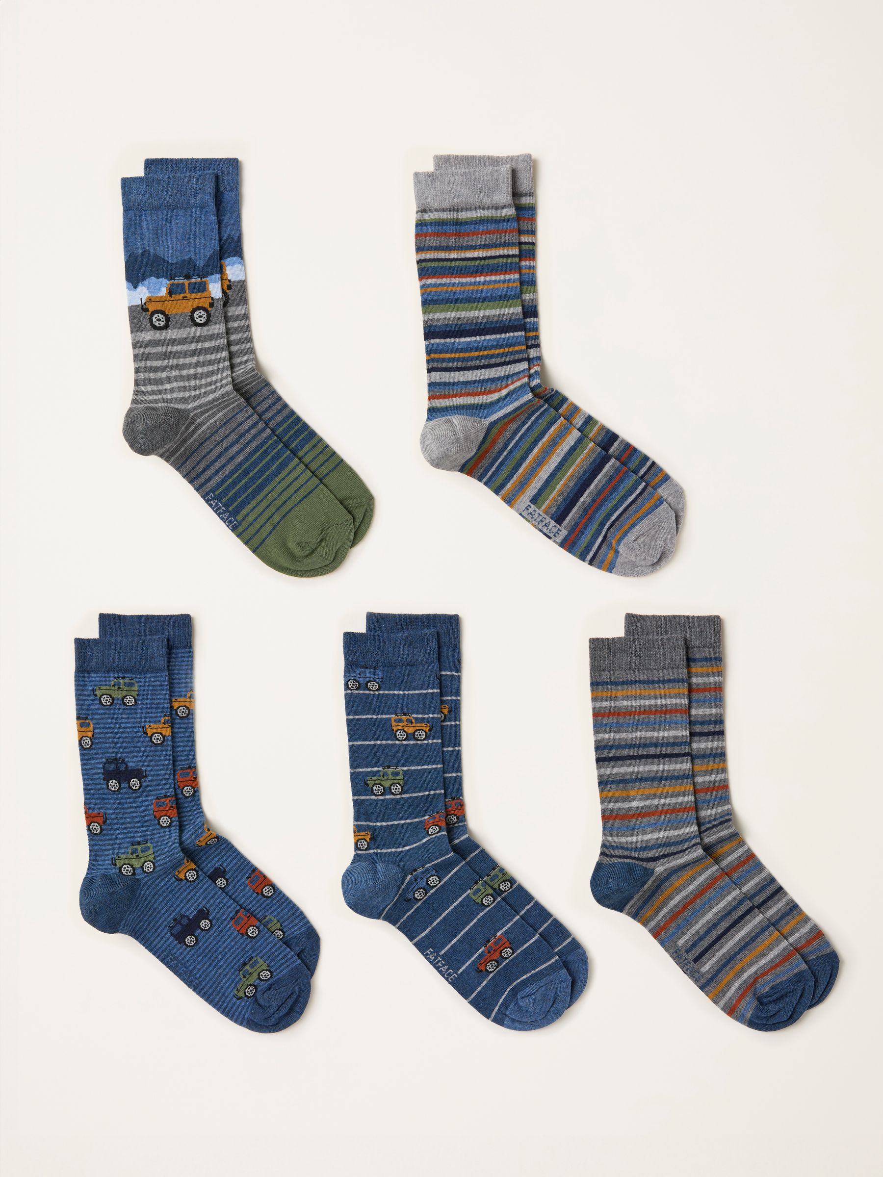 5 x Sock 1&5 77% Cotton, 22% Nylon, 1% Elastane. Sock 2 70% Cotton, 29% Nylon, 1% Elastane. Sock 3 78% Cotton, 20% Nylon, 2% Elastane. Sock 4 71% Cotton, 28% Nylon, 1% Elastane.Machine washable.