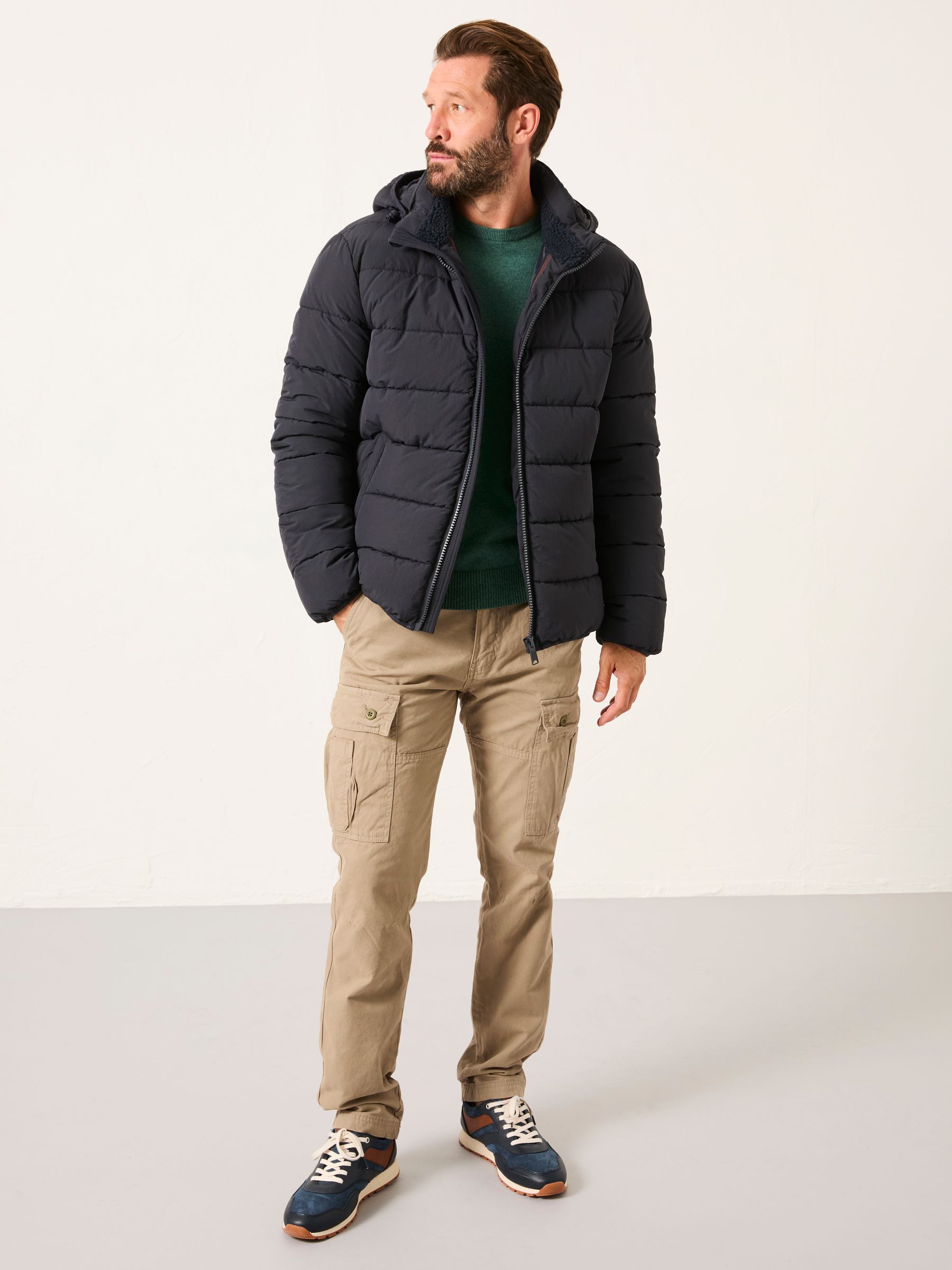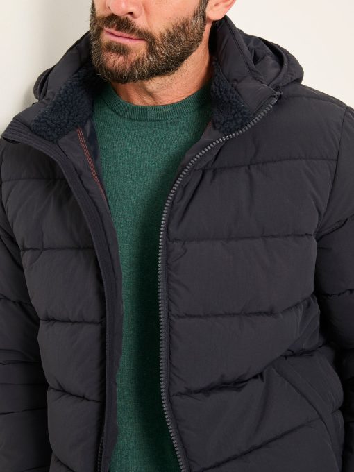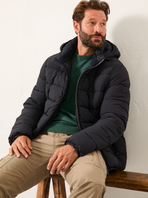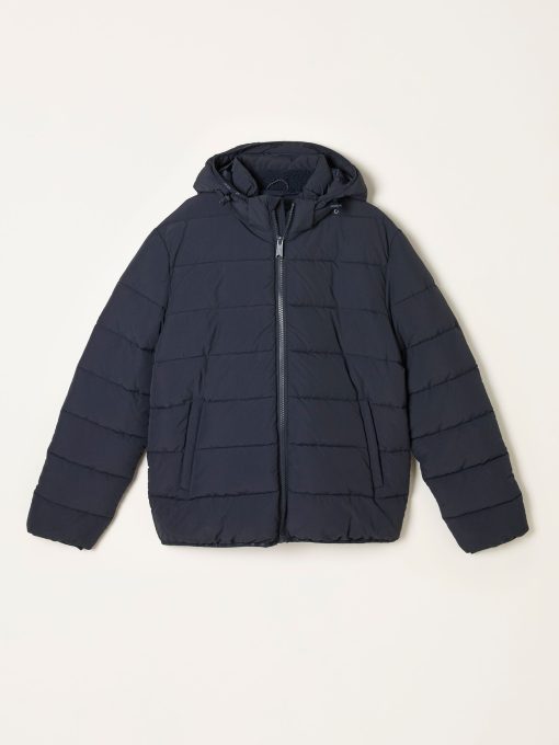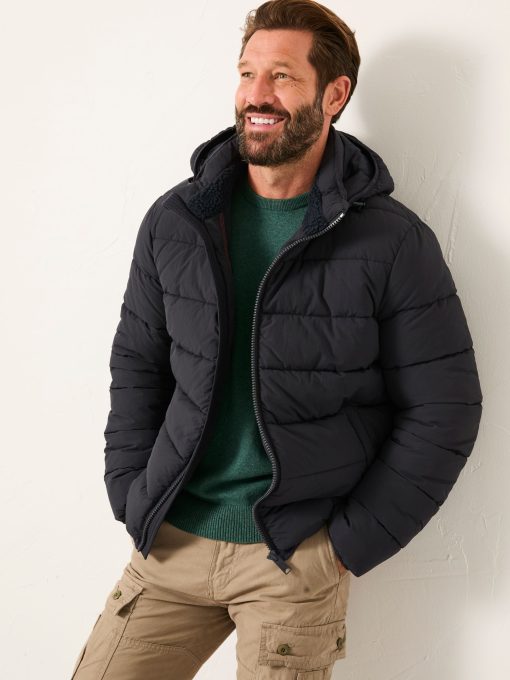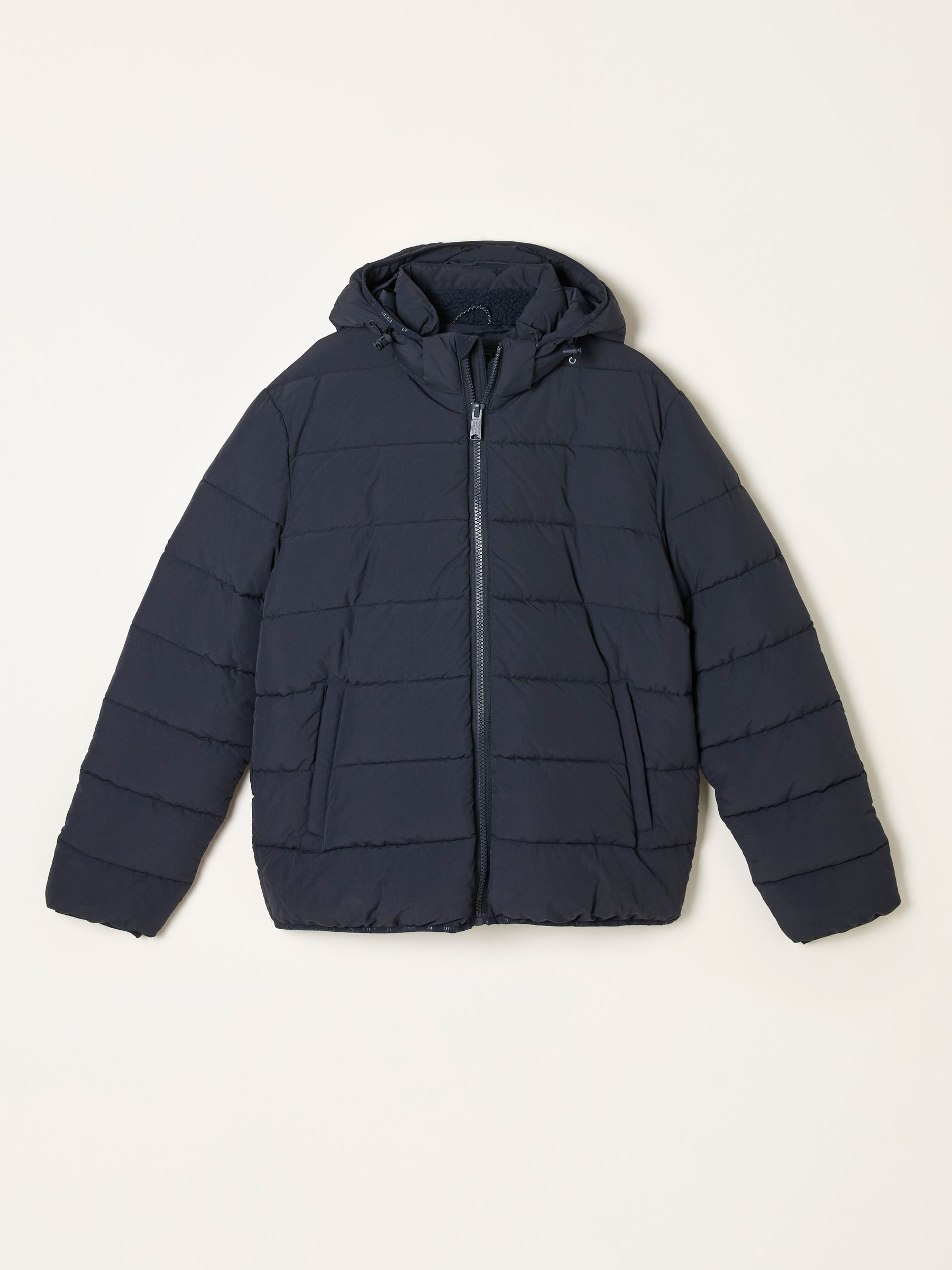 At FatFace, our jackets are versatile and easy to style for so many different occasions. This 100% nylon puffer jacket is perfect for that everyday casual style. Featuring large internal and external pockets for all your essentials, a cosy fleece lined inside and a removable hood, it is that staple jacket to add to your wardrobe. Layer over a knitted jumper for those colder days or pop on over a T-Shirt for a light layered look.Model is 6’1”/185cm and wears UK size MRegular centre back neck to hem 28.5" / 73cm.