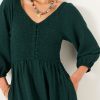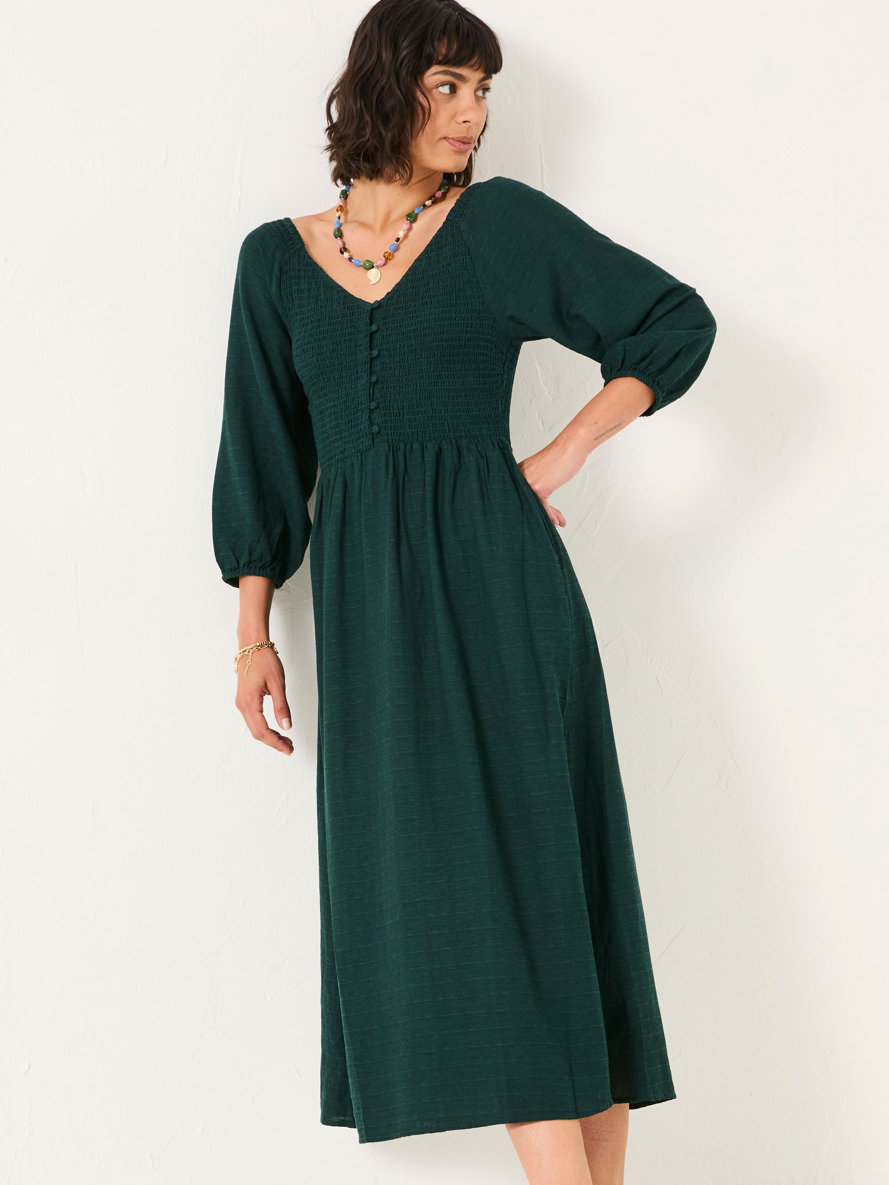 Our beloved Adele dress is back and better than ever – now featuring a flattering V-neckline on one side and a classic square neckline on the other, so you can wear it your way. Thoughtful button details add a polished touch, while side pockets, soft elasticated sleeves, and a gently structured bodice keep the ease and elegance you’ve always loved. From workdays to weekends, just add a jacket and your favourite footwear – now available in a fresh range of beautiful colours.Model is 5’9”/175cm and wears UK size 8Regular side neck to hem 50.5" / 128cm.