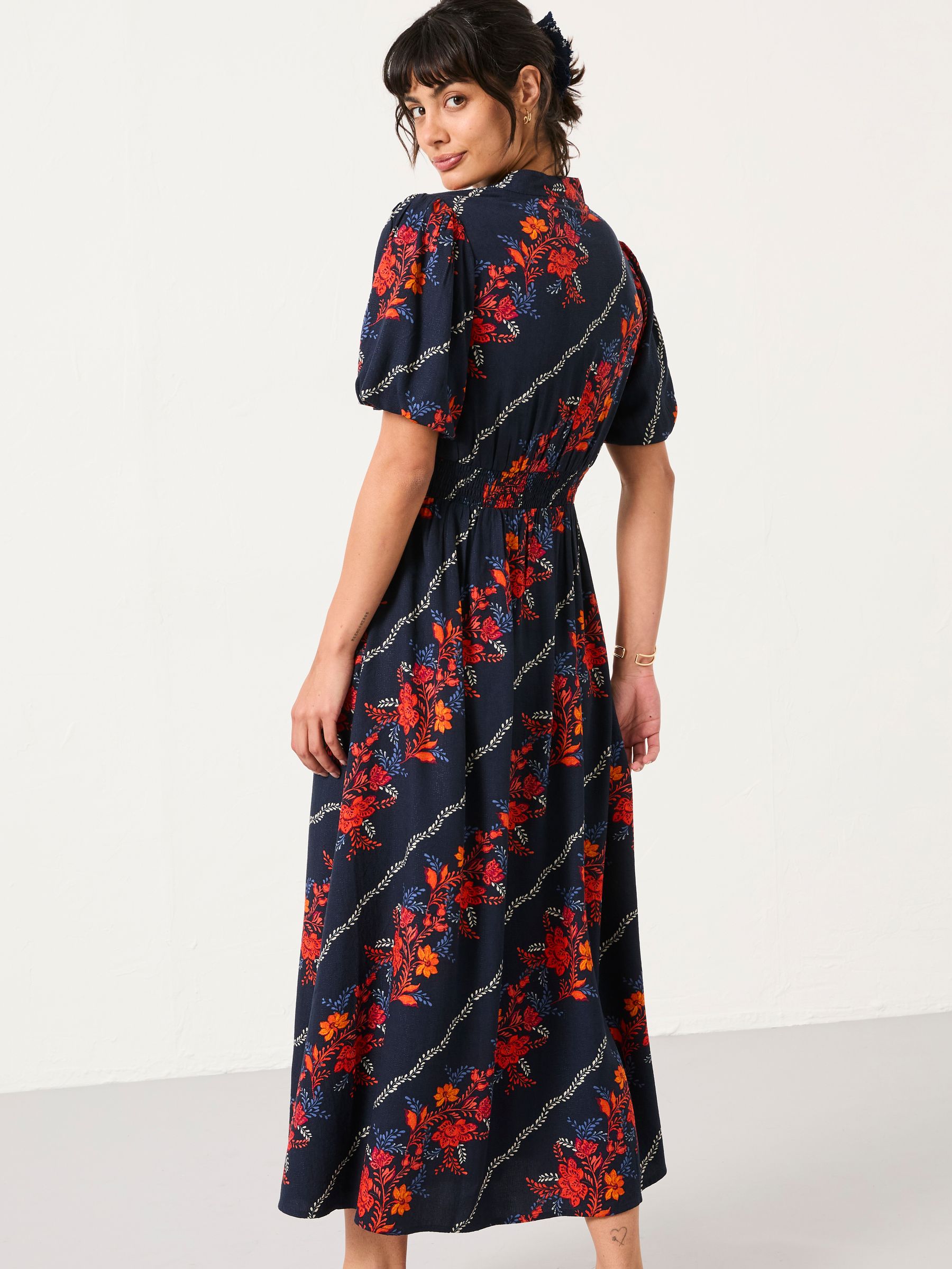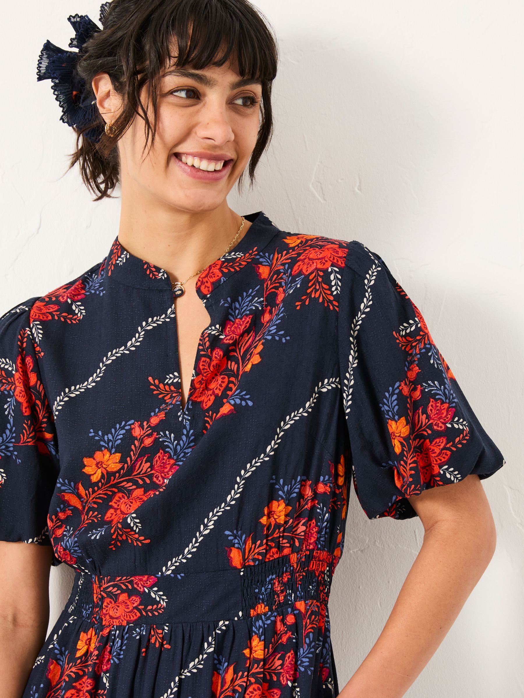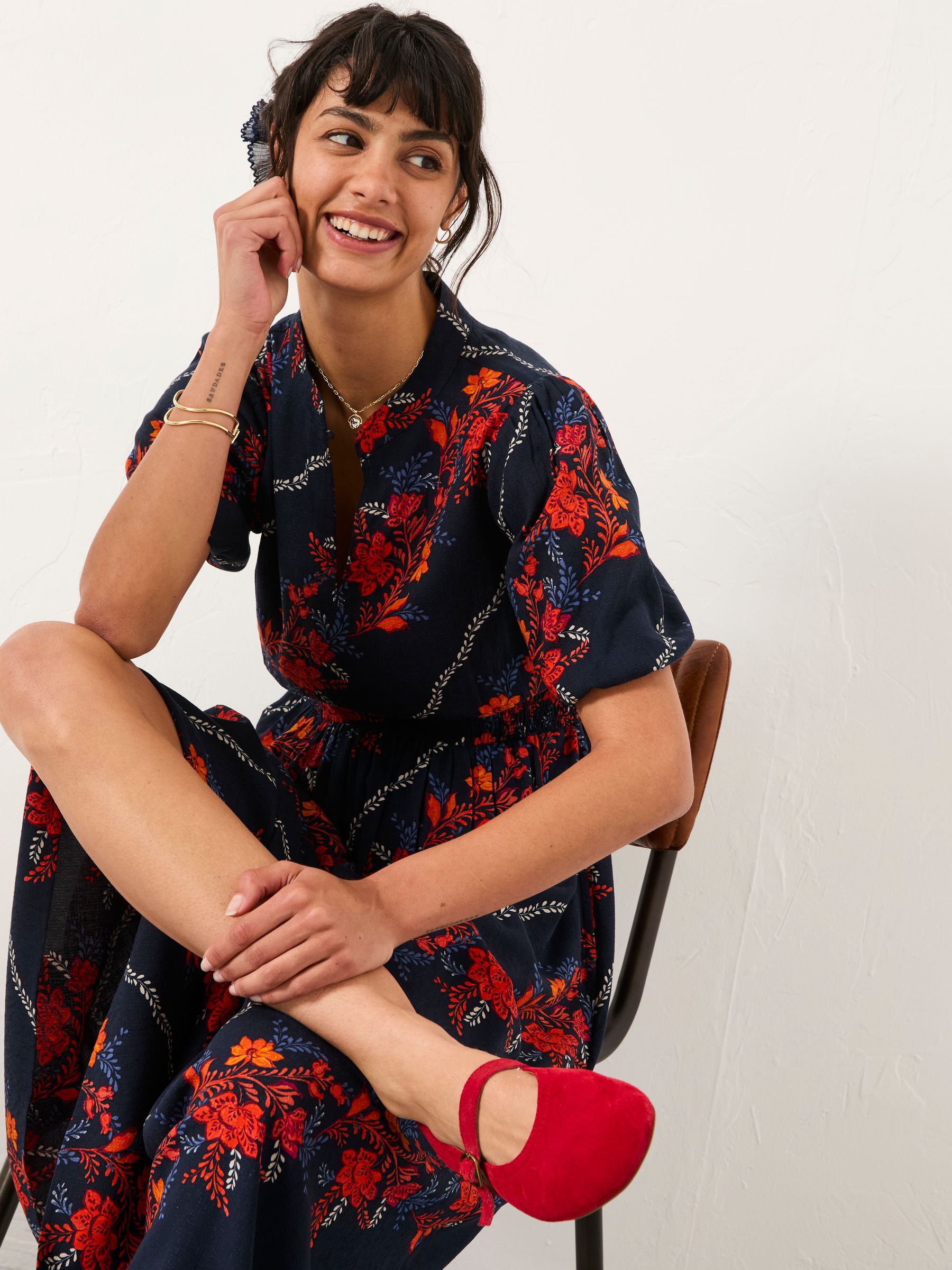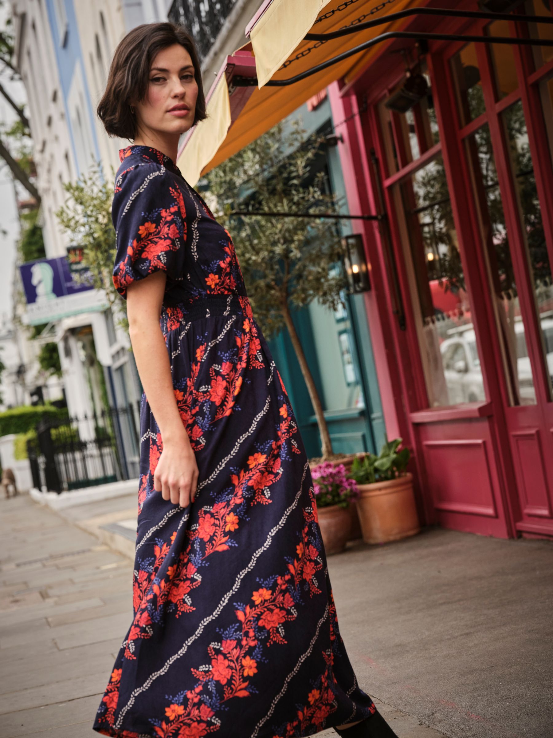 The Becky Midi Dress is the perfect dress to elevate your wardrobe. Featuring a flattering midi length, a stunning floral design, a v-neck shape and short, puffed sleeves, it is versatile and practical all while being made from soft fabrics, keeping it breathable and comfortable for everyday wear. Pair with trainers and a cardigan for a more casual, everyday look, wear with boots and tights for those chillier days or style up with heels and jewellery for your weekend plans.Model is 5’9”/175cm and wears UK size 8 LongRegular side neck to hem 49.5" / 126cm.