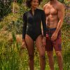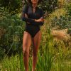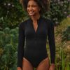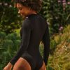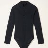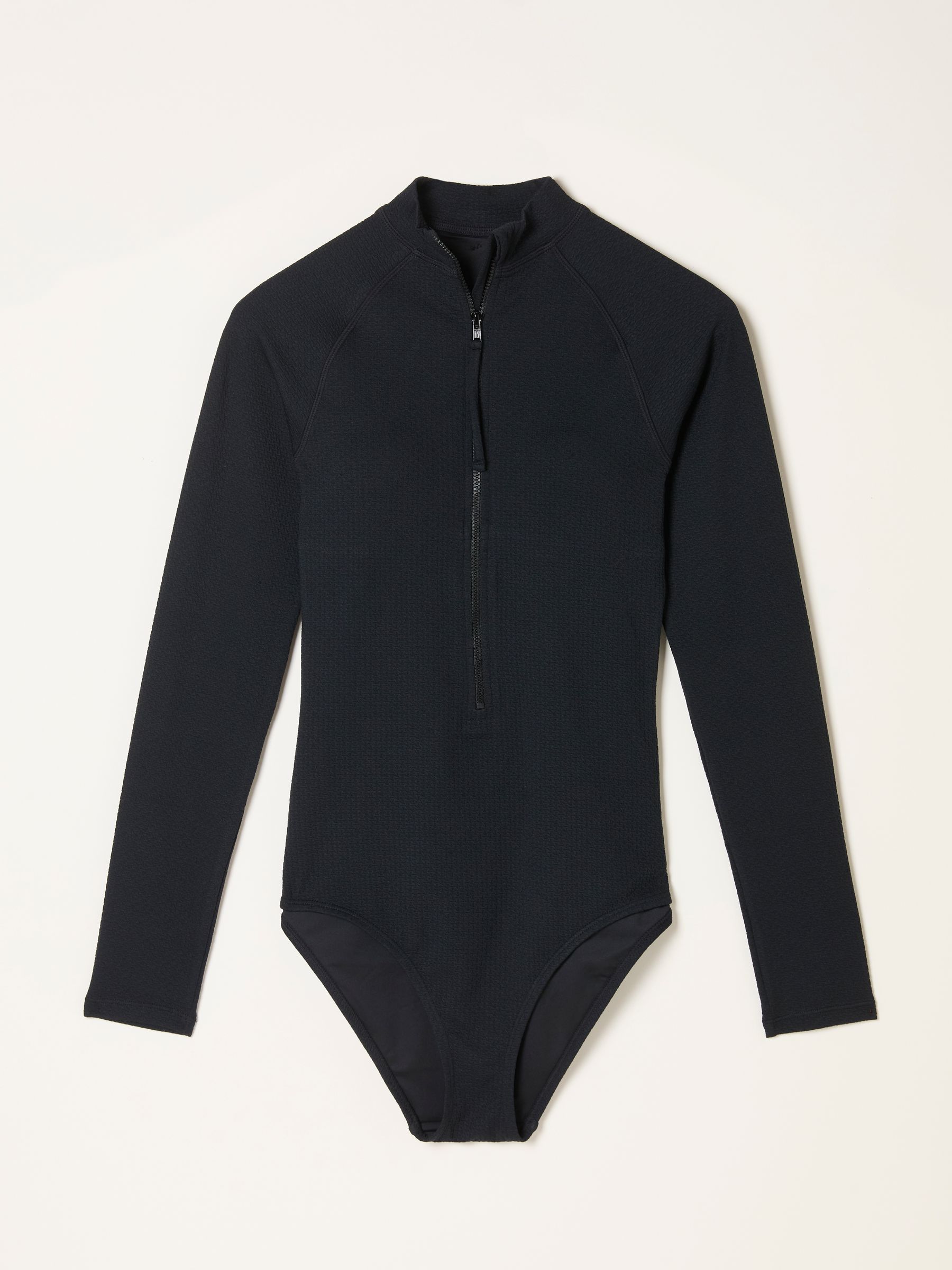 Stay protected and stylish in this long sleeve textured swimsuit. Made from a stretchy, textured fabric, it offers a sleek fit and added coverage. The front zip adds a sporty touch and adjustable comfort, making it perfect for active days at the beach or pool.