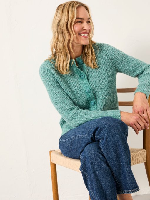 Fat Face Women’s Faye Teal Blue Ribbed Crew Neck Knitted Cardigan | Teal Blue