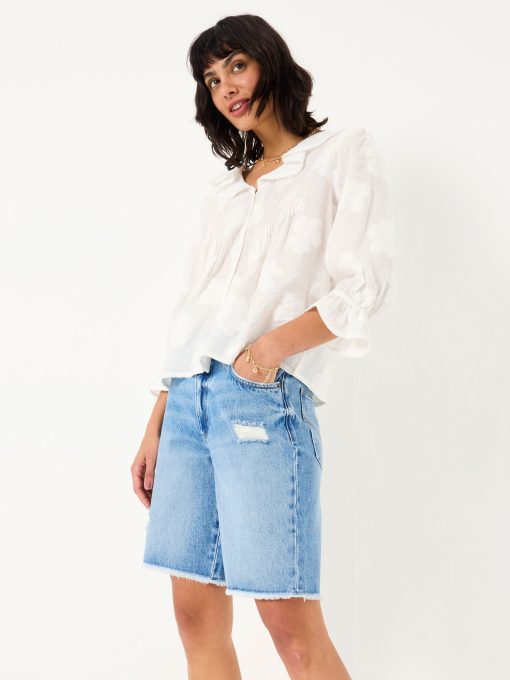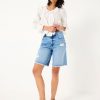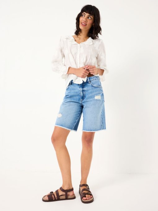 Our long denim shorts are the ultimate staple shorts for all your summer plans. Featuring a flattering fit, a light blue wash and a distressed details, pair them with a basic t-shirt for weekend strolls, over a bikini for an effortless beach cover up or with a flowy blouse for elegant evenings on holiday. Made with you in mind, they are the ultimate comfy denim shorts that are breathable and easy to wear all day long.Model is 5’9”/175cm and wears UK size 8