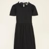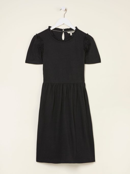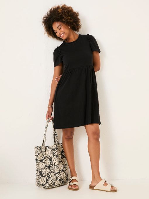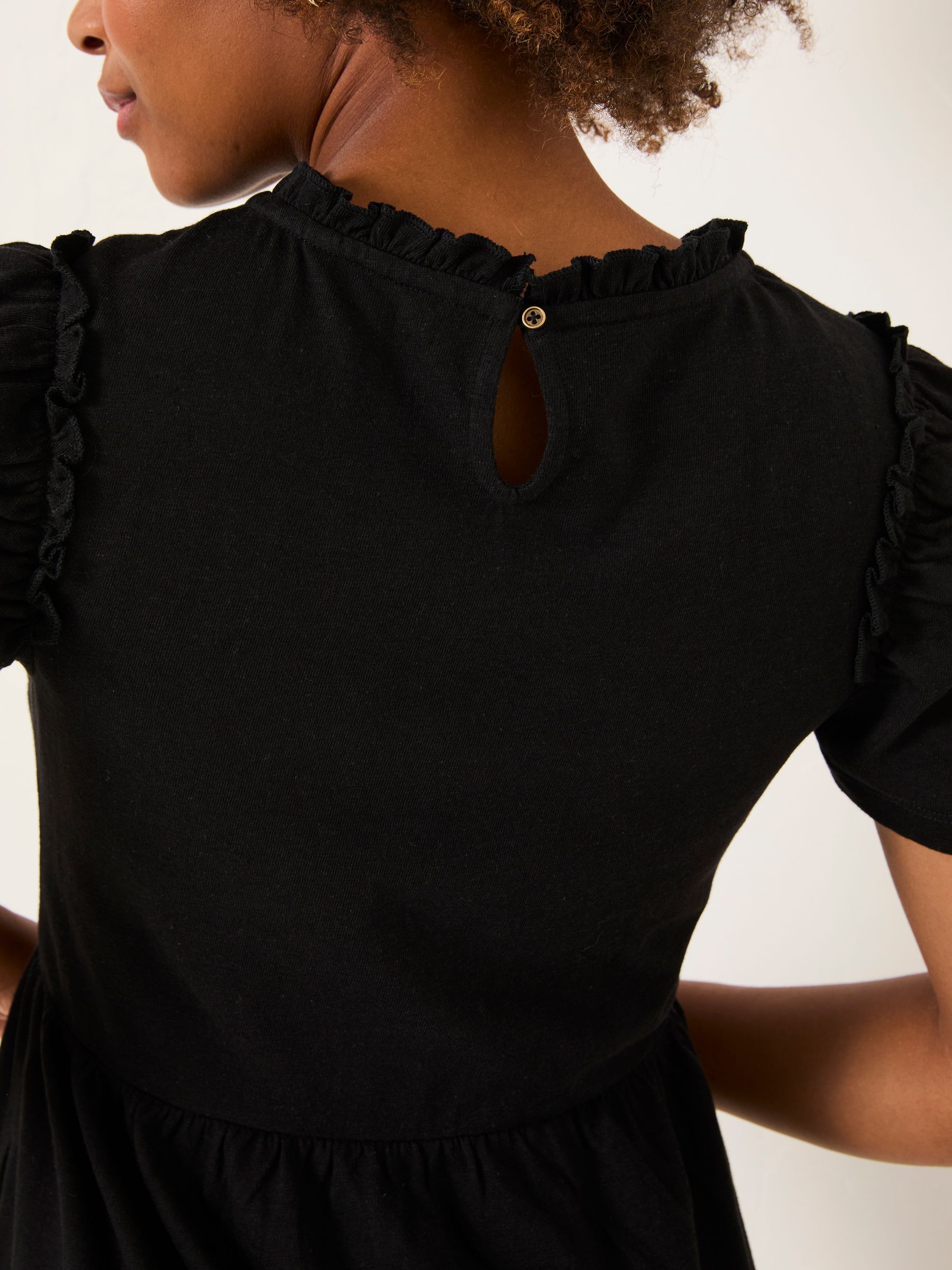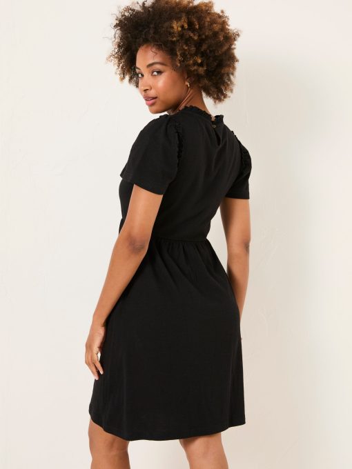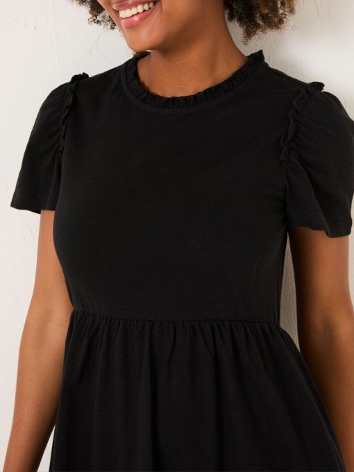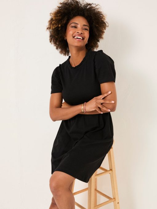 Soft, effortless, and made for days when comfort meets style. This jersey dress features delicate frills around the neckline and shoulder seams, adding a feminine touch to its everyday ease. Soft rouching at the waist creates a flattering shape, while the flowy silhouette moves effortlessly with you. Perfect for weekend plans, office days, or wherever the day takes you—just slip it on with your favourite sandals and go.Model is 5’8”/173cm and wears UK size 8 RegularRegular side neck to hem 37" / 94cm.