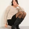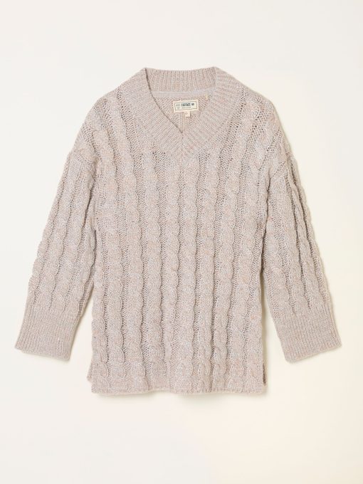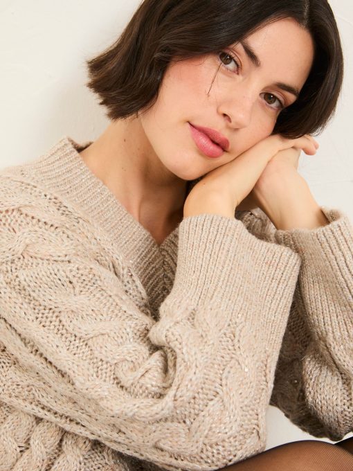 Stay stylish and cosy all day long in our Maeve sparkle cable knitted jumper, featuring a flattering v-neckline, cuffed sleeves and waistline and longer, loose fit. Crafted from a soft fabric blend, this jumper is comfortable and ready to wear with all your favourite outfits. Whether you dress it up with a skirt or pair with a staple pair of denim jeans for everyday wear, our knitted jumpers will be your new favourite cosy piece.